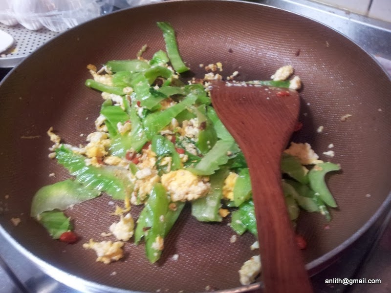 3-用玄米油先炒成散蛋再加入切好的芥菜心拌炒.起鍋前加入枸杞和鮮味炒手在伴一下即可